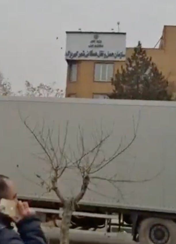 06:19: The video cuts and moves closer to the complex entrance. The main entrance gate and, in the distance, signs for “Kahrizak Public Transport Organization” and the “Diagnostic and Laboratory Center.” A container branded MARAL is also visible, presumably used for body transport.