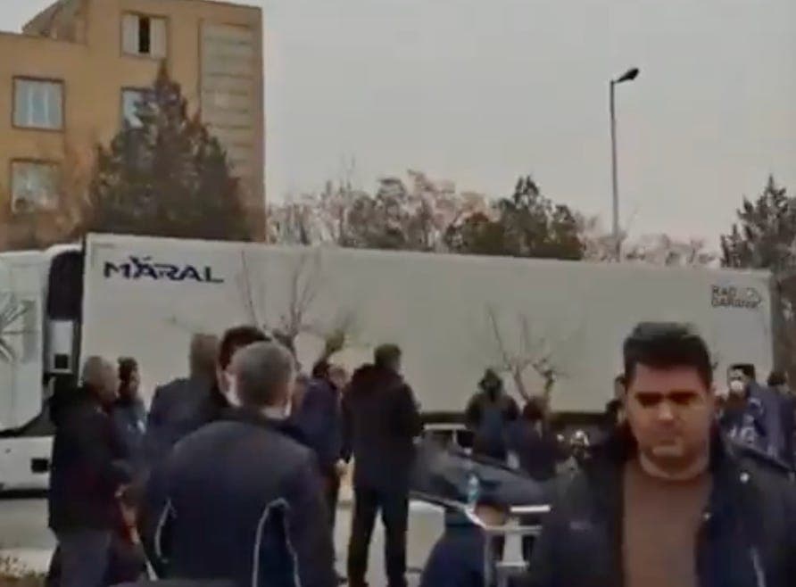 00:56: The scene changes to a composite of several short clips. A white van labelled “Shahed-shahr (a city in Tehran province) Municipality Cemetery Unit” is visible Based on visual clues, this segment appears to have been filmed on the southern road of the complex, near the main building with blue-patterned walls.