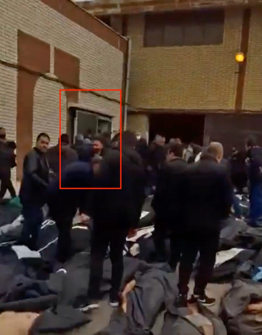 Inside, the warehouse is completely dark, but sounds indicate people are present. Another video shows the interior fully, filled with bodies.