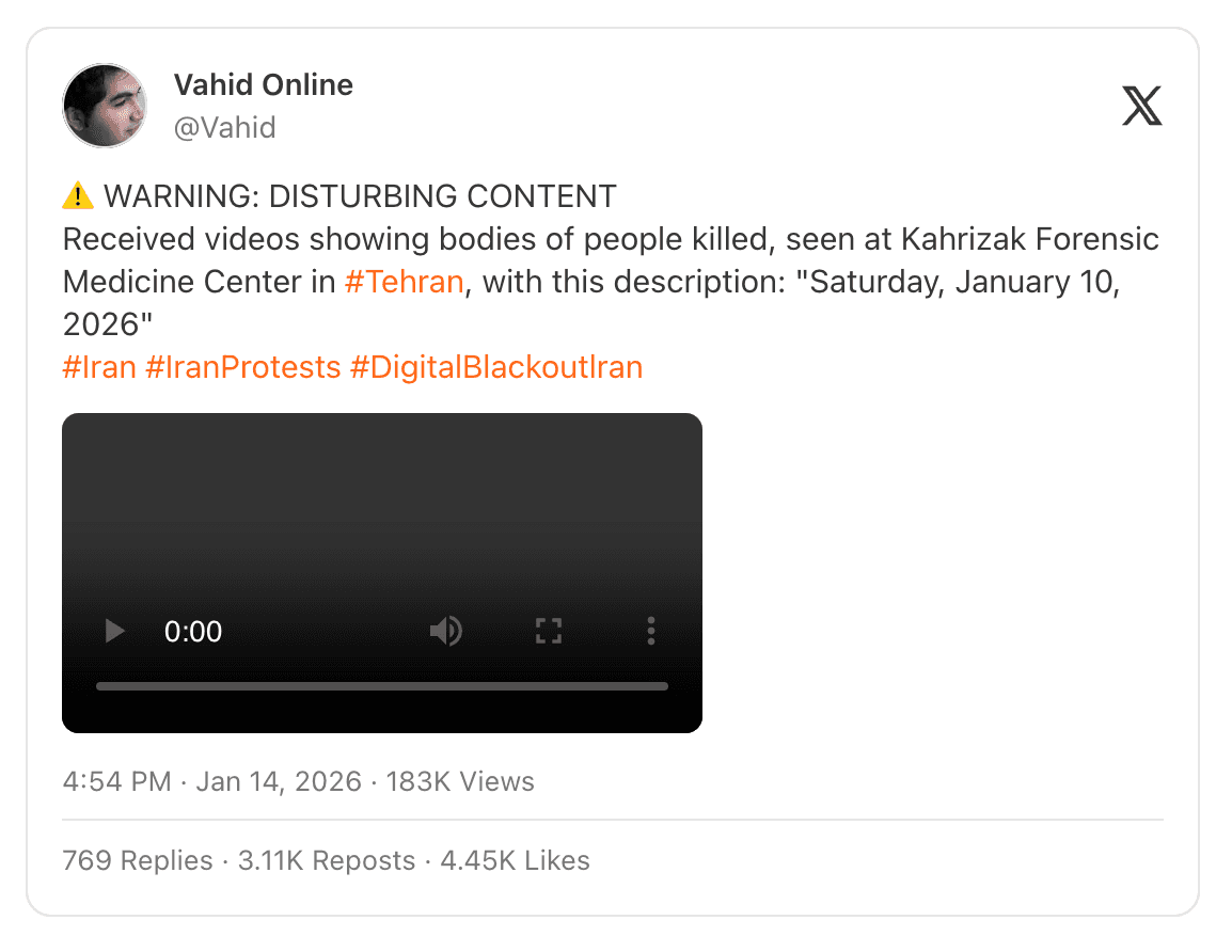 It remains unclear whether all bodies transferred to Kahrizak came from Greater Tehran or from elsewhere in Tehran Province. The IRIB video mentions the city of Shahriar, and social media footage shows body-transport vans marked “Shahedshahr,” a city in Shahriar County.