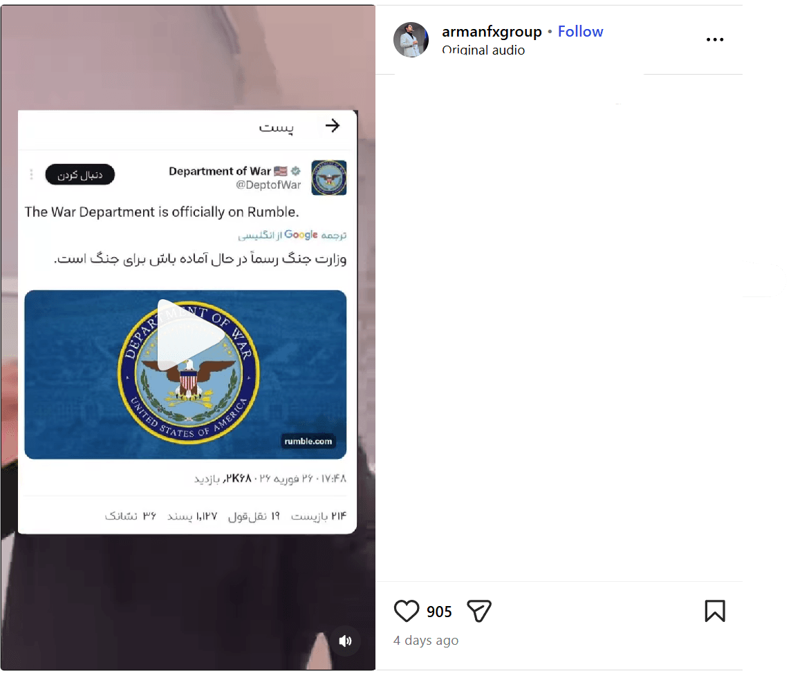 On 27 February 2026, a claim circulated on social media stating that the U.S. “War Department” had officially announced it was on war alert. The claim is based on a screenshot of a post on X that read, “The War Department is officially on Rumble.” The post refers to the launch of an account on the video-sharing platform Rumble, not a declaration of military readiness. The word “Rumble” in this context is the name of a platform and does not indicate combat status or mobilization. The translation shared online misrepresented the original message. Some accounts, including pages focused on financial markets, amplified the mistranslation while promoting trading signals. The claim that the United States officially declared war readiness is false.