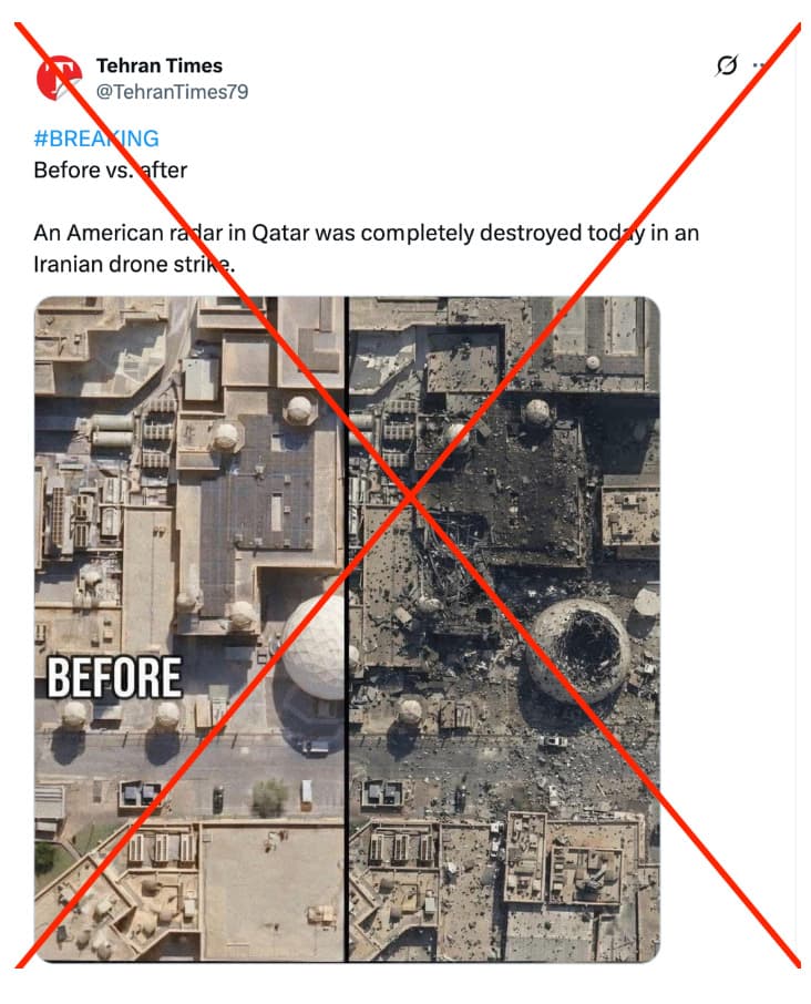 An aerial photo shared by the Twitter account “Tehran Times” claims to show a U.S. radar in Qatar destroyed in an Iranian drone strike. The image is not authentic. Analysis shows it is AI-generated and based on a Google Earth image dated 2 September 2025. Key visual details, including vehicles appearing in identical positions across supposed “before” and “after” views, indicate manipulation. Additional elements visible in the alleged post-strike image do not appear in the original satellite photo. The location itself is misidentified: the site shown is the U.S. Navy’s Fifth Fleet headquarters in Manama, Bahrain, not Qatar or Al Udeid Air Base. The image circulating as evidence of the radar’s destruction is fabricated.