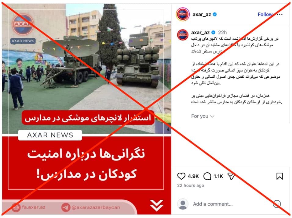 An image circulated on social media claiming to show heavy military equipment parked inside the courtyard of Karimian Primary School in Shahin Shahr, Isfahan. The claim is false. Analysis shows the vehicles were digitally added and the image was manipulated. In uncropped versions of the picture, a four-pointed star watermark associated with Google’s Gemini AI model is visible in the lower corner, indicating that the image was generated or edited using artificial intelligence. The military vehicles depicted, including what appears to be a Tor-M1 air defense system and a mobile radar unit, are too large to enter a school courtyard without structural damage, given the standard height limits for school entrances. The school itself publicly denied the claim and shared video from its courtyard showing no such equipment.