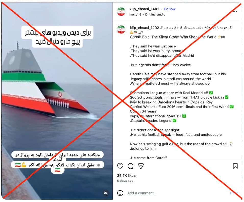In the days preceding the escalation of tensions, and amid speculation about possible U.S. military action against Iran, videos circulated on Instagram purporting to show advanced military equipment of the Islamic Republic. The clips, often set to dramatic music, depict scenes such as fighter jets inside aircraft carriers, missile transport trucks, ballistic missile launches, and drone patrols over the Persian Gulf. Captions describe them as evidence of Iran’s missile strength or combat readiness. However, these claims are false. The videos are AI-generated and do not show real military operations or equipment.