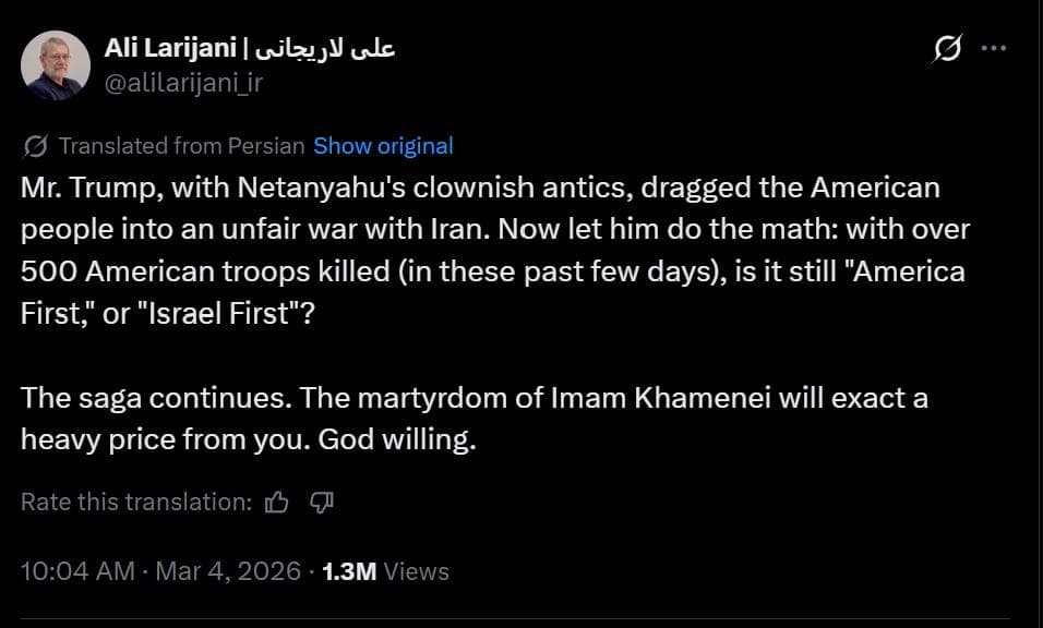 Ali Larijani, the secretary of Iran’s Supreme National Security Council, wrote on X that more than 500 American troops had been killed in the war with Iran in recent days, a claim that was widely repeated by accounts close to the Iranian government. He did not provide any evidence, details about where the deaths occurred, or the identities of those allegedly killed. Available reporting does not support the figure. Official statements from the U.S. military confirmed the deaths of six American service members at the time the claim circulated. In other statements from Iranian officials, casualty figures referred to a combined number of killed and wounded rather than deaths alone. No credible reports or independent sources have indicated that hundreds of U.S. troops were killed. The claim represents a severe exaggeration.