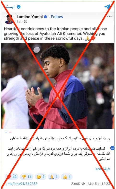 A claim circulated online saying Lamine Yamal, the Barcelona football player, had expressed condolences for the death of Ali Khamenei. The claim spread widely in Persian as well as English, Arabic, and French posts. No such message appears on Yamal’s official accounts on Instagram, TikTok, or YouTube, where he rarely posts about political or social issues. The claim appears to have originated from a Facebook fan page using his name. The page itself states that it is not the footballer’s official account and is only a fan page.