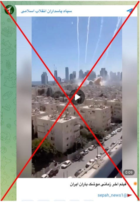 A video circulated on Telegram channels linked to the IRGC under the title “Apocalyptic footage of Iran’s missile barrage.” The clip appeared to be filmed from the window of a building where an Israeli flag was visible, implying that it showed Iranian missiles striking Israeli cities. Several elements in the footage show that it was not real. The rooftops across the neighborhood look nearly identical and repeat the same pattern, suggesting the scene was artificially generated rather than filmed in a real city. No credible news outlets reported or verified the footage. These details indicate the video was created using AI.