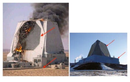Left: AI-generated image. Right: authentic satellite image of the radar site