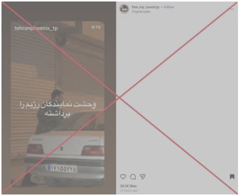 A video circulated on social media claiming to show a member of Iran’s Revolutionary Guard fleeing with his family. In the clip, a man in a military uniform and a woman wearing a chador rush toward a car and quickly get inside, while a man filming the scene can be heard saying, “They are escaping.” Several elements in the footage show that it was not real. At the beginning of the video, a strange shadow briefly appears and then disappears, the woman’s face is never clearly visible, and the car’s license plate does not match the format used in Iran. The audio also sounds unnatural, as the voice of the person filming resembles studio audio rather than sound recorded outdoors.