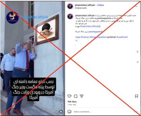 An Instagram video suggested that the U.S. defense secretary had installed a sign showing Ali Khamenei’s turban and glasses on a mound of dirt at the Pentagon. The footage had been altered. The original video was recorded in November 2025, when U.S. Defense Secretary Pete Hegseth installed a new “Department of War” sign at the Pentagon’s main entrance, replacing the long-standing “Department of Defense” plaque. In the version shared online, the original sign was digitally replaced with the image of the turban and glasses, creating the false impression that such a display had taken place.