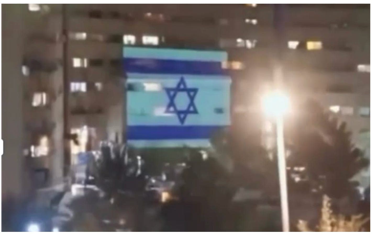 Digitally manipulated video falsely showing Israeli flag projected on an apartment block in Tehran
