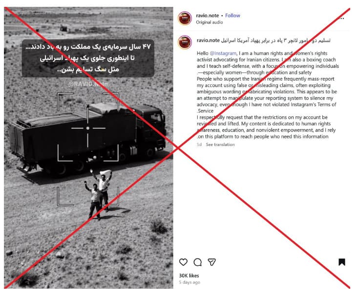 Since the start of the war between the Islamic Republic, Israel, and the United States, false claims and manipulated media circulating across Persian-language social media have tended to cluster around a few recurring themes. A large share of posts focus on the battlefield, with fabricated strikes, attacks, and military incidents presented as real events, often reinforcing either pro–Islamic Republic or anti–Islamic Republic messaging. Others revolve around the newly appointed supreme leader, where AI-generated videos and altered clips are used to construct speeches, appearances, or public reactions that did not occur. At the same time, a number of claims come directly from officials, often contradicted by available evidence.