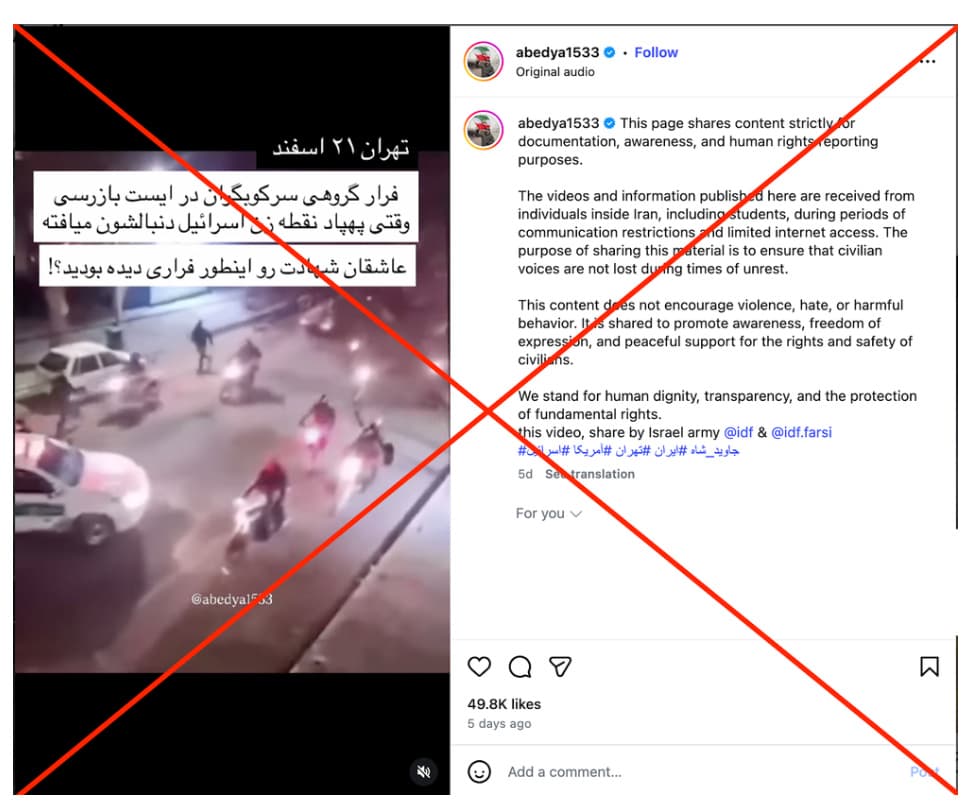 An Instagram video showing several motorcyclists fleeing while a police car turns and joins them is being shared as footage from Tehran on March 11, 2026, allegedly after security forces spotted an Israeli drone. However, the same video was already posted on January 24, 2026, with a different explanation, before the current conflict began.