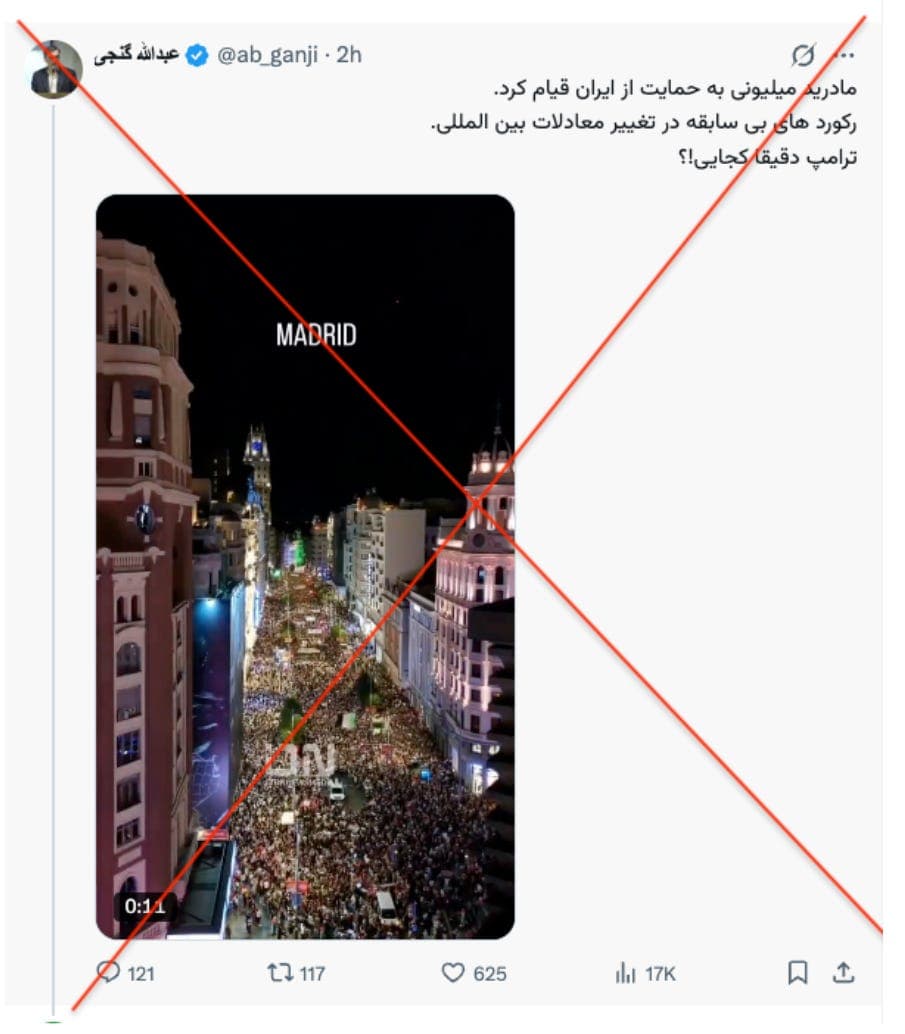 Abdollah Ganji, a political figure close to conservative circles, shared a video claiming a large protest in Madrid was held in support of Iran. The footage does not show any pro-Iran demonstration and predates the current events. The video actually shows a pro-Palestinian protest held in Madrid on October 4, 2025, where Palestinian flags are visible throughout the crowd. The claim misrepresents an unrelated protest to suggest international support for Iran.