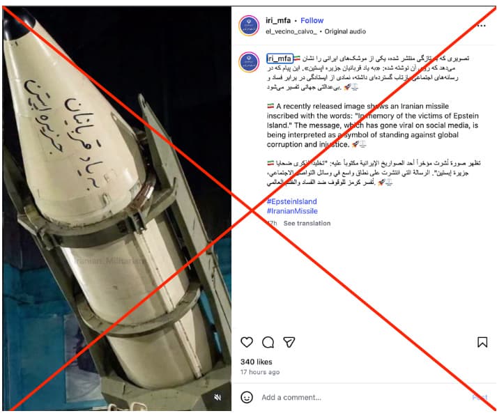 An image shared by official Iranian accounts claims a missile carried the message “in memory of Epstein Island victims,” but the text was added later. The original photo of the missile had been published earlier without any such writing. The mismatch between the original and edited versions shows the image has been manipulated. The claim that the message appeared on the missile is false.