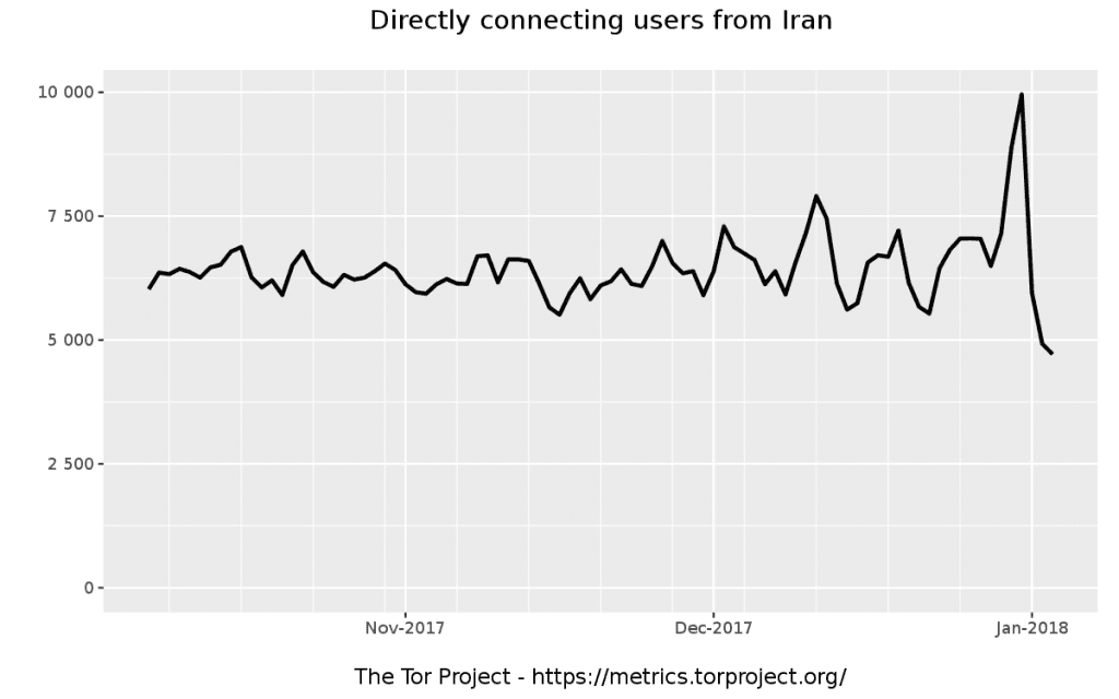 شبکهی ناشناسساز Tor نرمافزاری رایگان است که به کاربران اجازه میدهد بدون افشا شدن هویتشان اینترتگردی کنند و سانسورِ اینترنت را دور بزنند. اطلاعاتِ سایتِ Tor متریکز در زیر، نشان دهندهی جهش ناگهانی در استفاده از Tor در روز سی و یکم دسامبر بوده است. این همان زمانی است که شرکتهای سرویسدهندهی اینترنت شروع به مسدود کردن اینستاگرام و تلگرام کردهاند.
